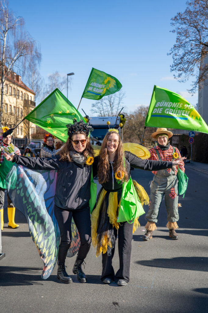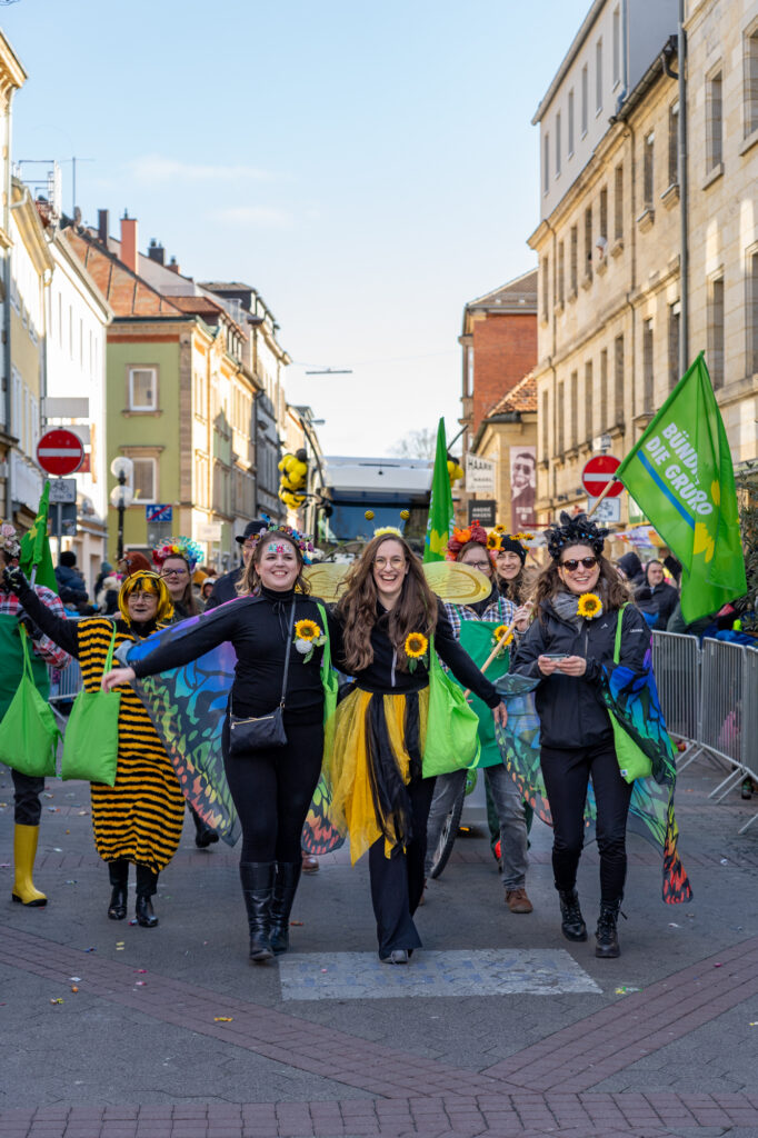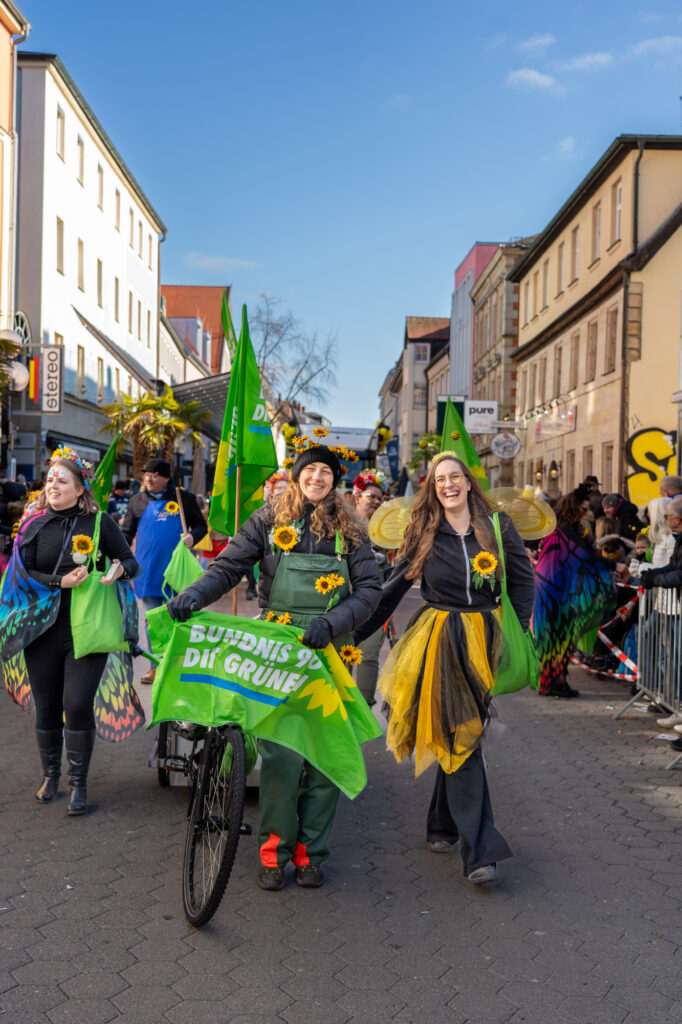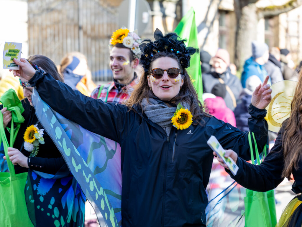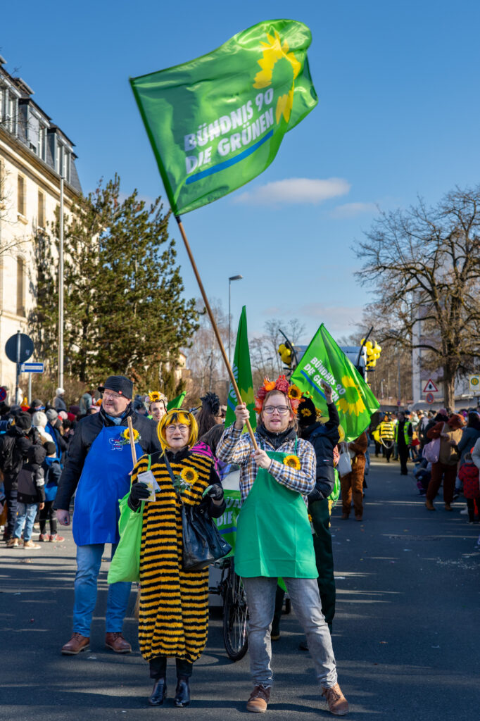 Mit einem farbenfrohen und symbolträchtigen Auftritt machten sich Bayreuther Grünen beim traditionellen Faschingsumzug am Sonntag stark für Umweltschutz, Gemeinschaft und urbane Biodiversität. Unter dem Motto „Hier kommen die fleißigen Bienchen und Gärtnerinnen von den Grünen! Heute wird nicht diskutiert, sondern geackert – für Blümchen in unserem schönen Bayreuth“ zieht die Partei durch die Innenstadt, angeführt von ihrer Oberbürgermeisterkandidatin.