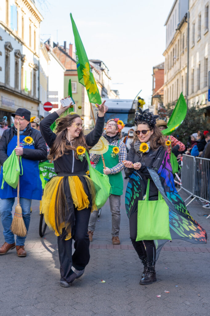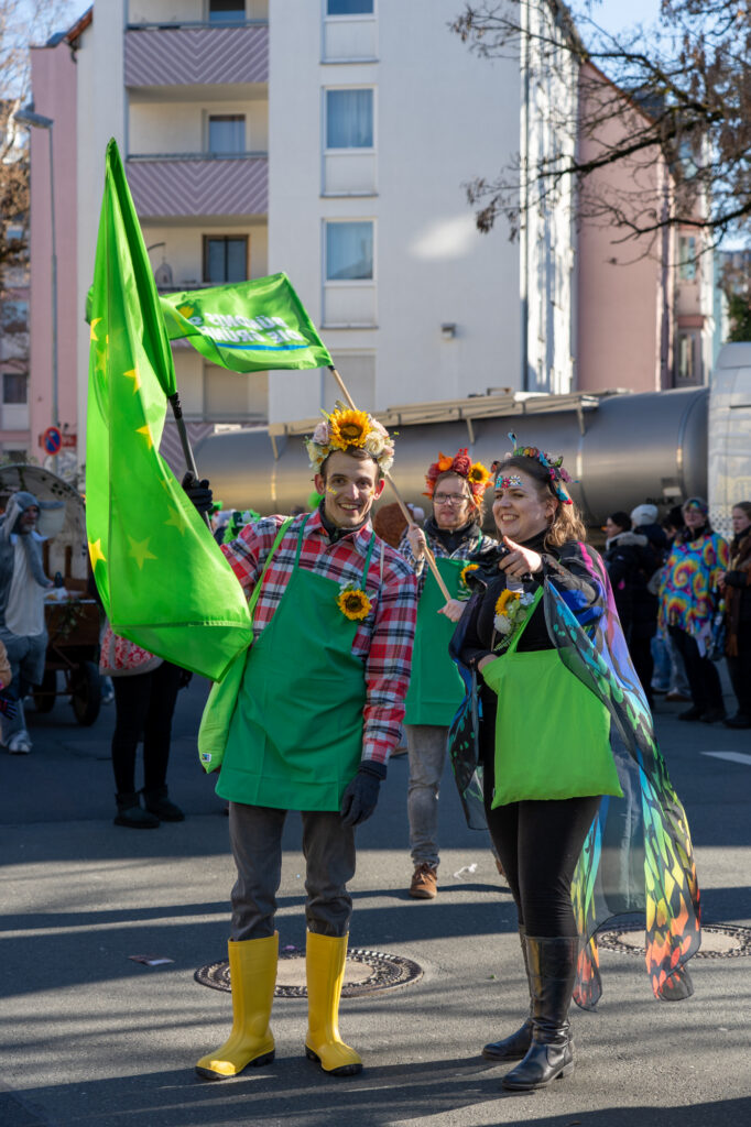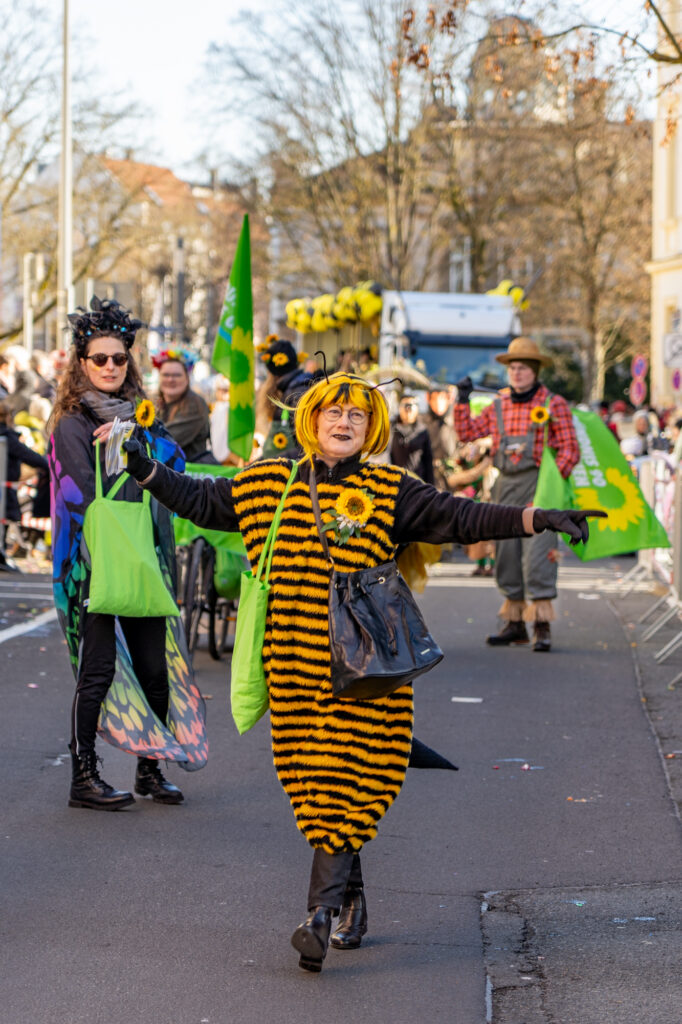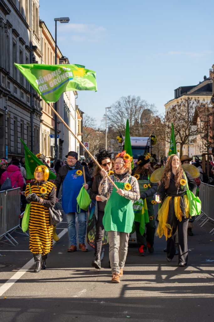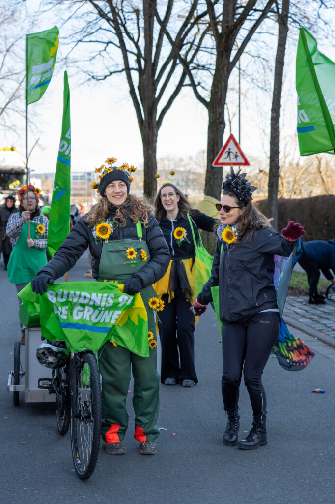 Mit einem farbenfrohen und symbolträchtigen Auftritt machten sich Bayreuther Grünen beim traditionellen Faschingsumzug am Sonntag stark für Umweltschutz, Gemeinschaft und urbane Biodiversität. Unter dem Motto „Hier kommen die fleißigen Bienchen und Gärtnerinnen von den Grünen! Heute wird nicht diskutiert, sondern geackert – für Blümchen in unserem schönen Bayreuth“ zieht die Partei durch die Innenstadt, angeführt von ihrer Oberbürgermeisterkandidatin.