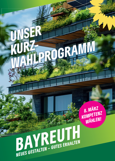 Kommunalwahl 2026 OB-Wahl und Stadtratswahl am 8. März 2026 Unsere OB-KandidatinSabine Steininger UnsereStadtratsliste Unser Wahlprogramm Unsere Themen Stadtentwicklungund Wohnen Mobilitätfür alle Klima, Umweltund Stadtökologie Innenstadtund Wirtschaft Kinder, Jugendund Bildung Sozialesmiteinander Kultur undSport